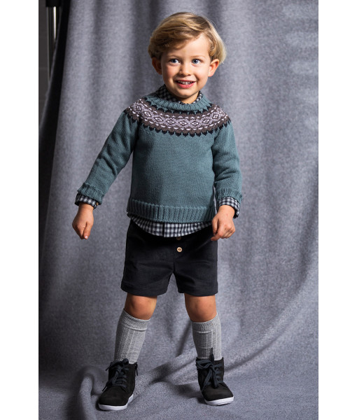 GORRO, JERSEY GRECA, CAMISA CUADROS Y BERMUDA GRIS