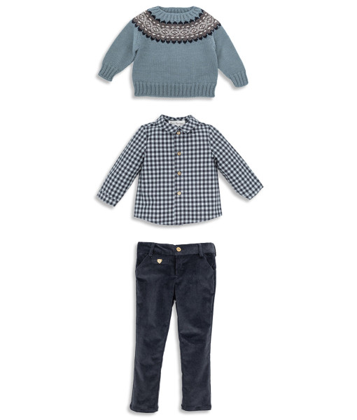 JERSEY GRECA, CAMISA CUADROS Y PANTALÓN GRIS