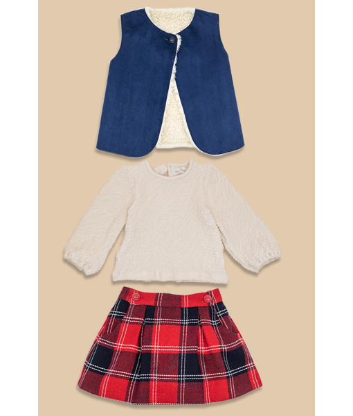 CHALECO, SUDADERA Y FALDA CUADROS TARTAN LANA ROJO