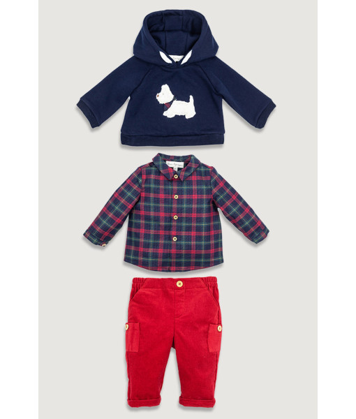 SUDADERA PERRO, CAMISA TARTAN Y PANTALÓN PANA ROJO